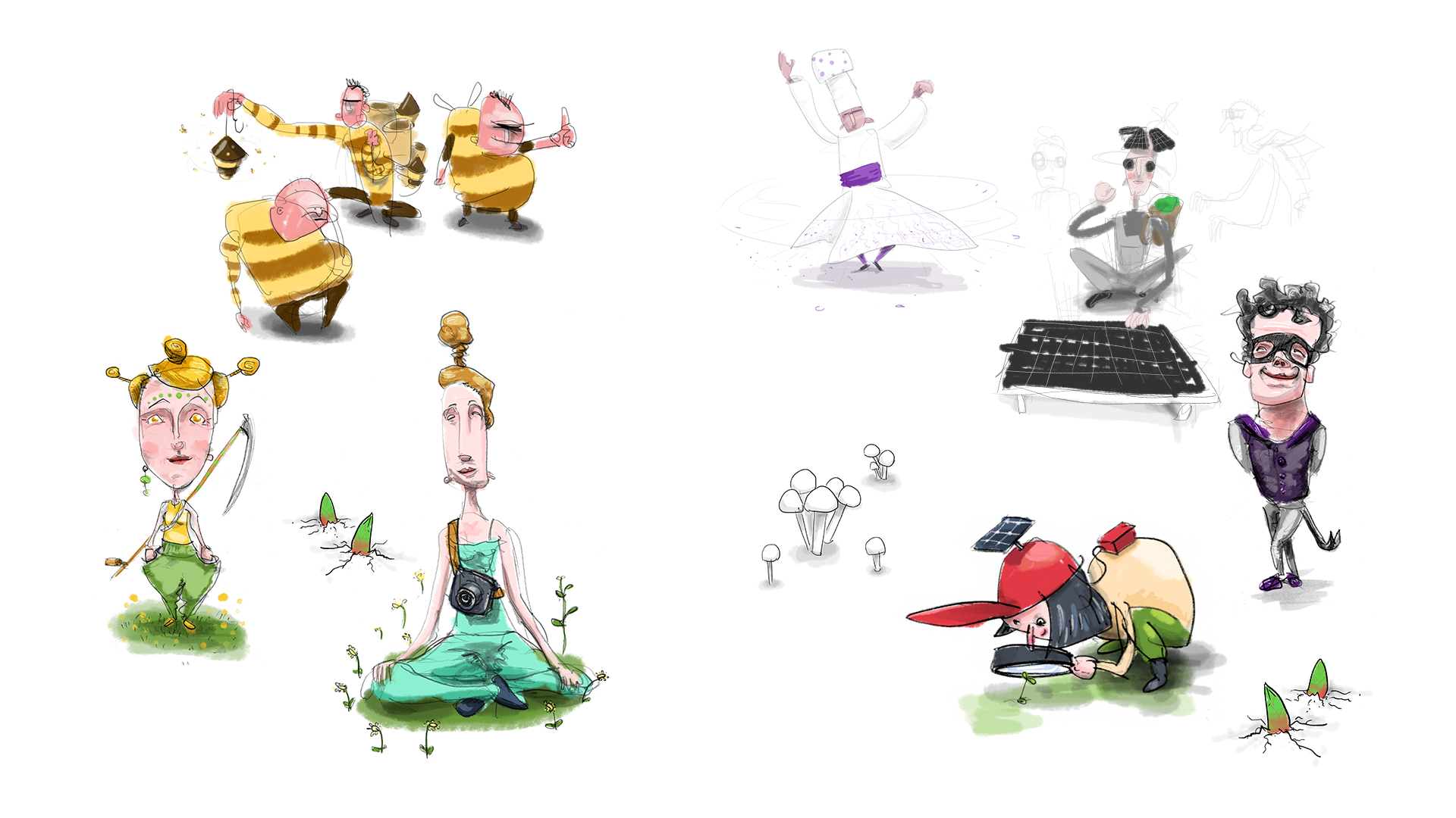 Nachwachstumsgesellschaft besteht aus steckbriefartigen, illustrierten Darstellungen exemplarischer Gesellschaftsgruppierungen. Diese werden unterstützt durch berührbare Artefakte. Und als dritte Komponente sorgen Infografiken, das Freipflanzermanifest und ein animiertes Stadtmodell für die nötigen Meta-Informationen, um in den Köpfen der Betrachter:innen eine komplexe Vorstellung dieser Gesellschaft zum Leben zu erwecken.