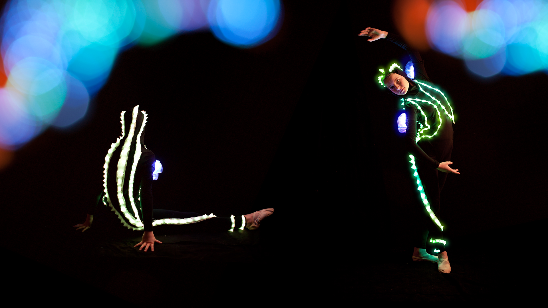 Das Kostüm besteht hauptsächlich aus einer Art Exoskelett, das sich um den Körper der Tänzerin windet und ihre Bewegungen in animierte Leuchtpattern übersetzt.