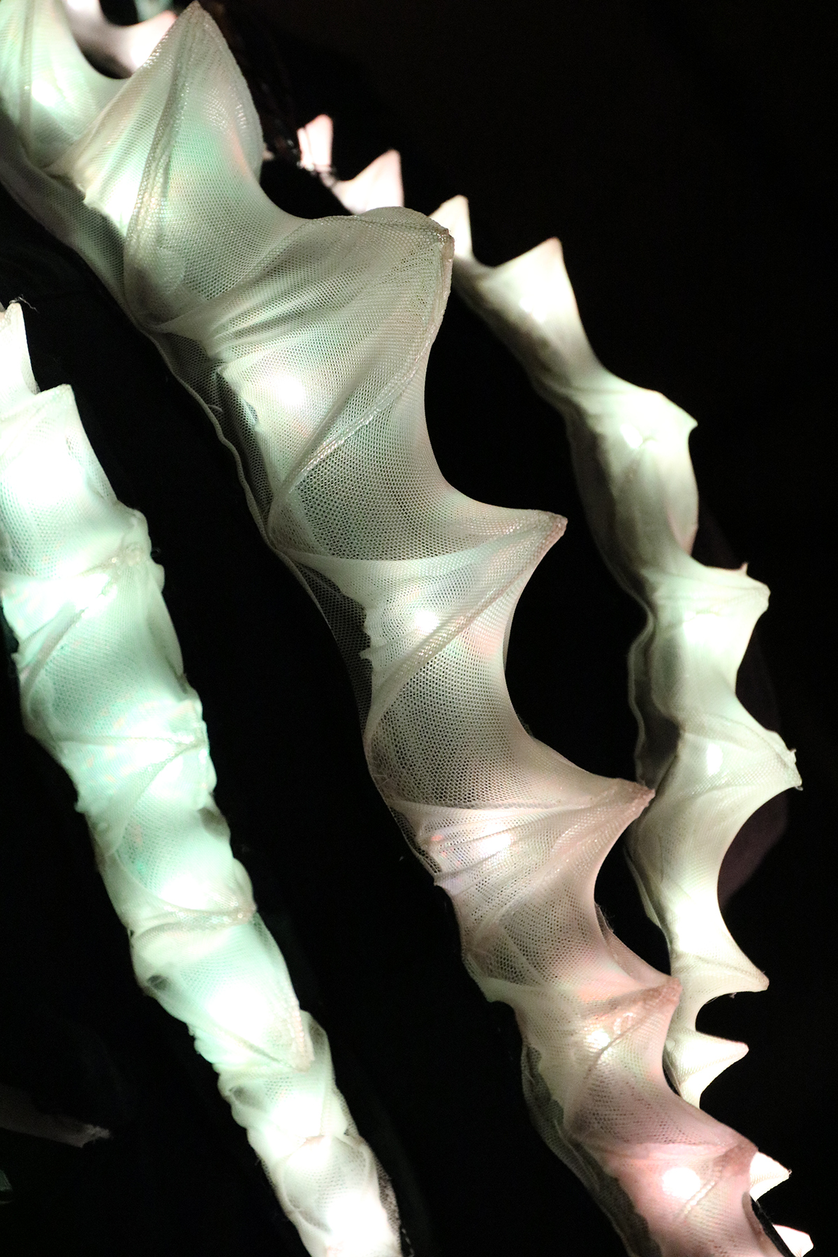 Das Exoskelett selbst besteht aus einer ausgeklügelten Kombination aus 3D-Druck, der direkt auf ein gespanntes Stretch-Tüll gedruckt wurde und sich beim Entspannen dann durch die unterschiedlichen Zugrichtungen selbst in diese endgültige Form zieht. Wobei 3D-Druck an dieser Stelle etwas irreführend ist, da ich mich aufgrund der Dimension der Grundfläche dafür entschieden habe, den "3D-Druck" mit einem 3D-Stift selbst auf das aufgespannte Tüll zu malen.