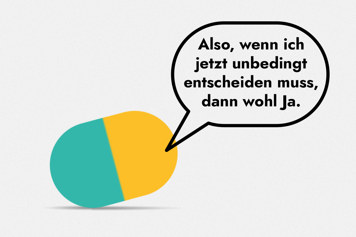 Das Ergebnis wäre dann zum Beispiel "Es sind zwar fast alle ein bisschen dafür, außer Jo. Und Kim ist soger entschieden dagegen."
