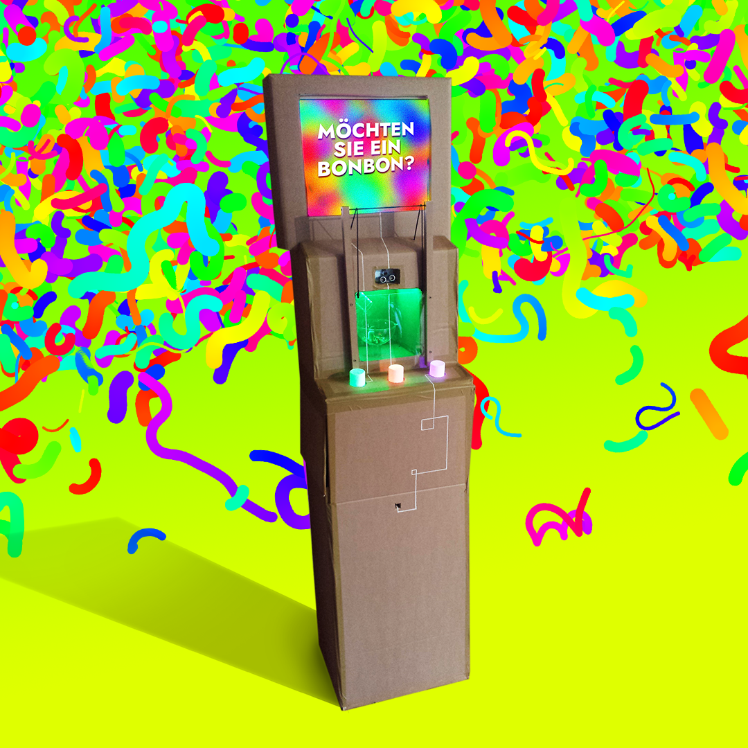 ...verspricht dieser interaktive Automat und lockt mit seinem bunten Display und beleuchteten Bonbons NutzerInnen an.