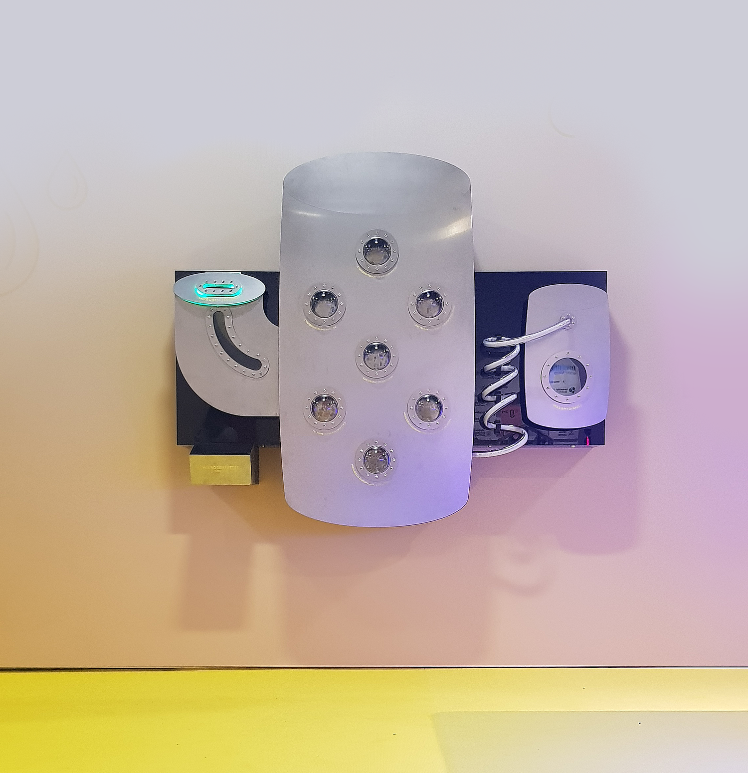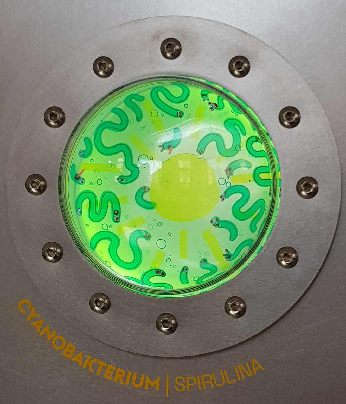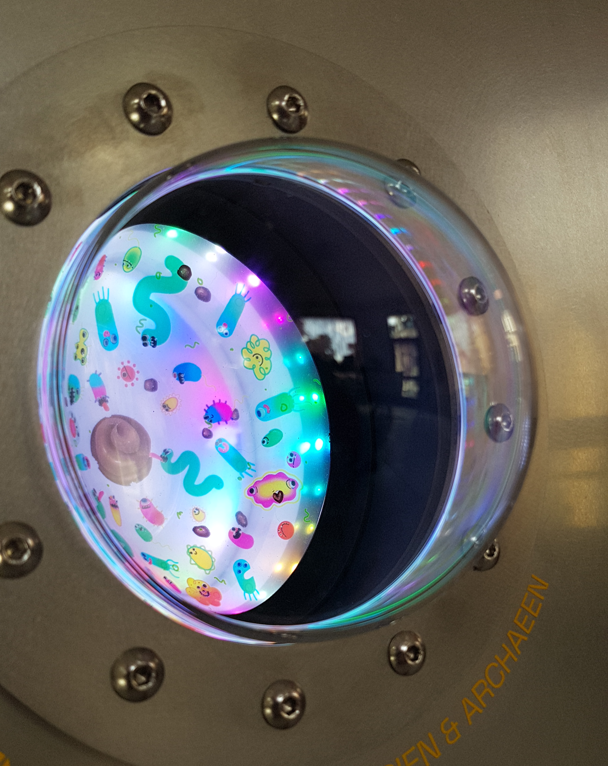 Gestalterisch ist das Gehäuse von Bioreaktoren inspiriert. Durch die Glaskuppeln können die Betrachter:innen die Mikroben bei der Arbeit beobachten. Die sympathischen Illustrationen, locker an das tatsächliche Erscheinungsbild der entsprechenden Mikroben angelehnt, sind nur dann zu erkennen, wenn das entsprechende Fenster beleuchtet wird. Man muss sich nah an die Kuppel heranbewegen um wirklich zu erkennen, was sich im Inneren befindet. So werden die Betrachter:innen dazu verleitet in einen intimeren Entdeckermodus zu wechseln. Wem dazu im Trubel der Ausstellung die Muße fehlt, der erfreut sich an der haptischen Erfahrung, einen Token einzuwerfen und den Lichtanimationen zuzusehen.