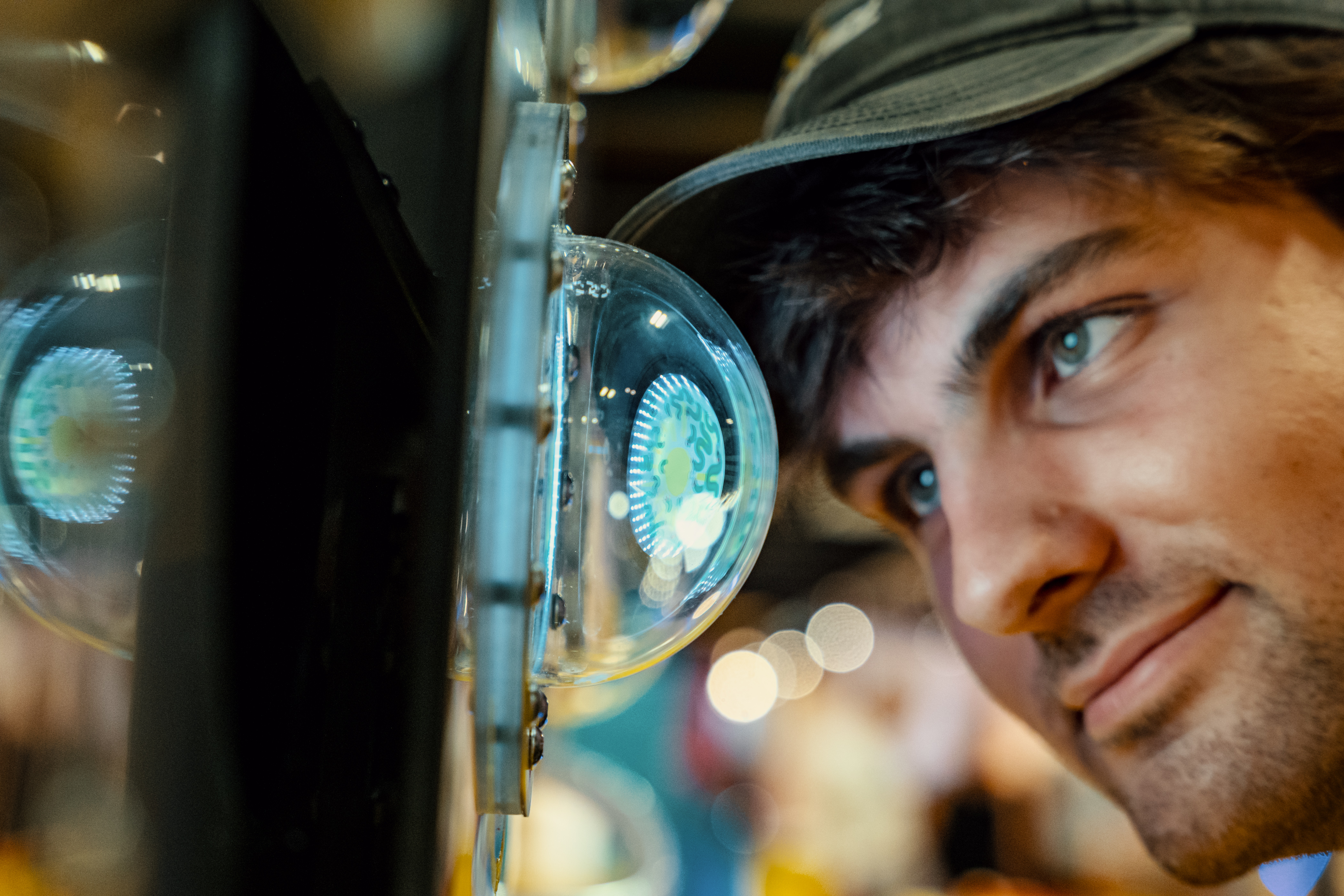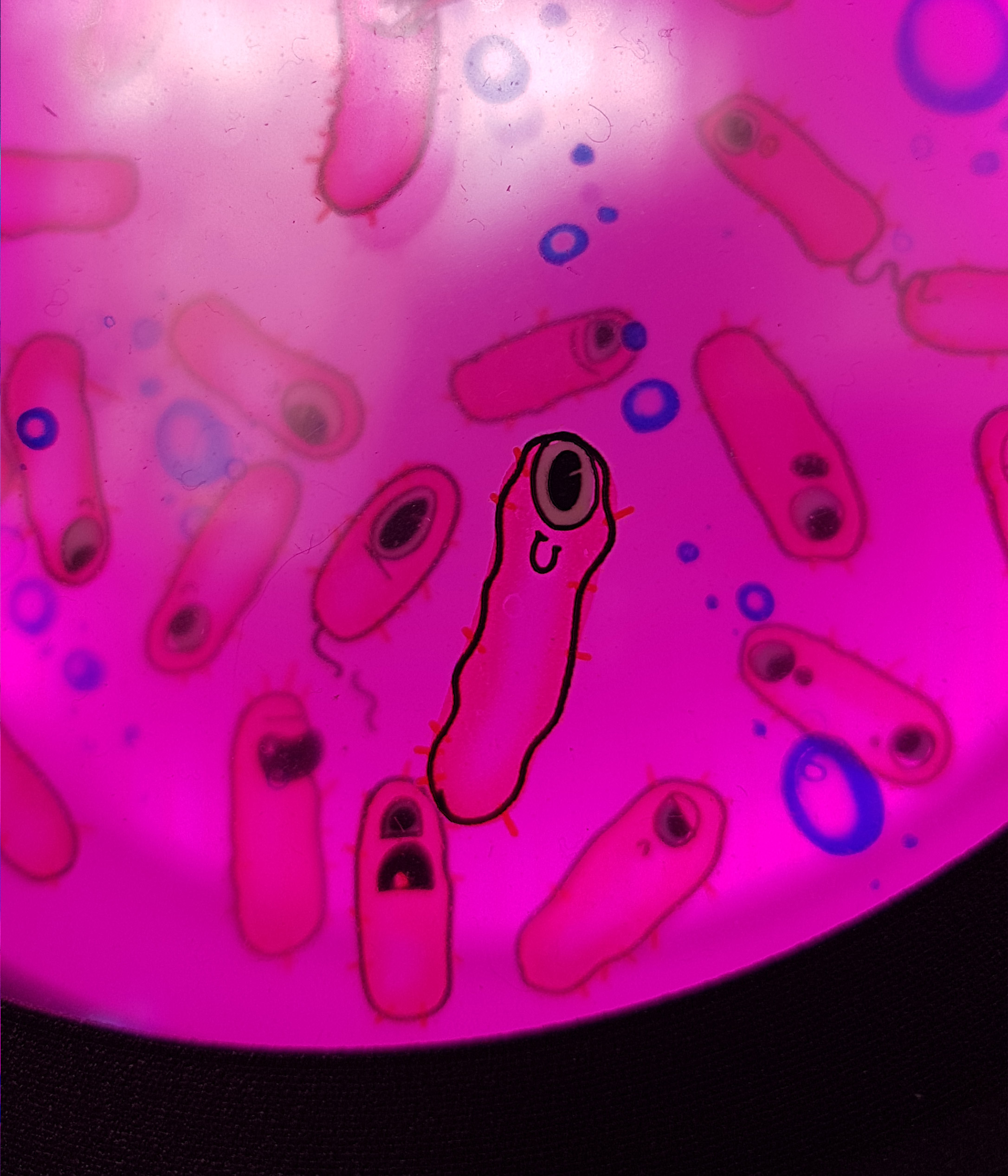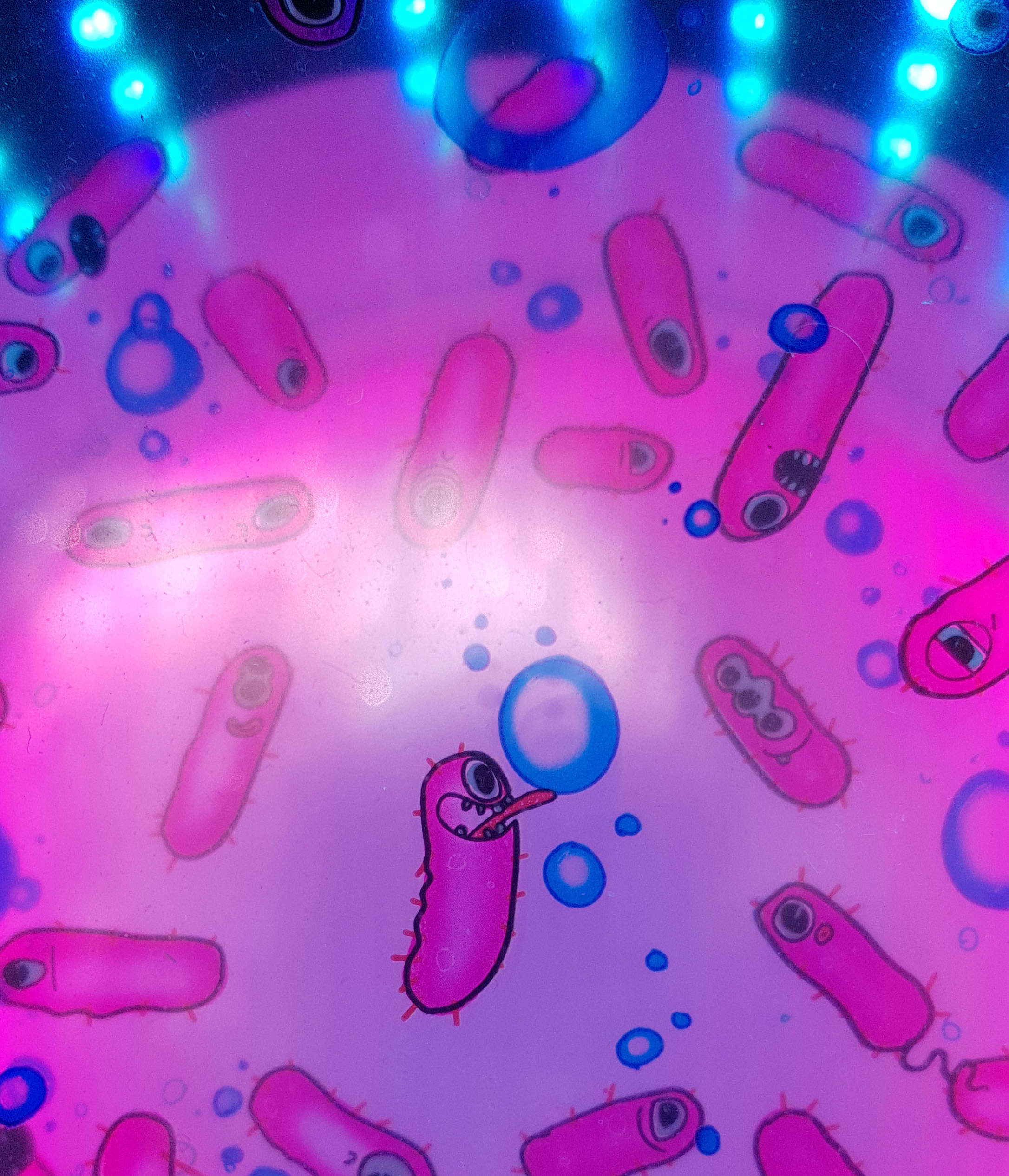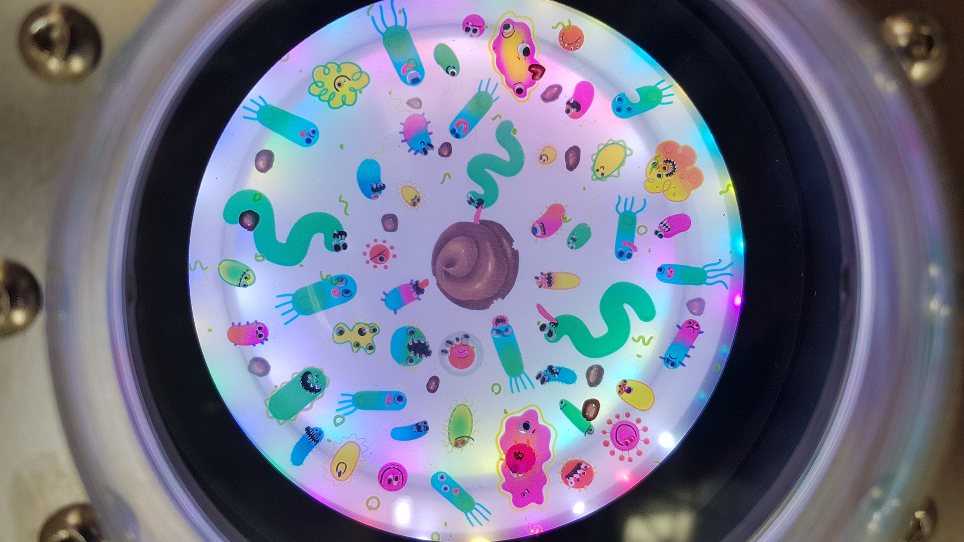 Gestalterisch ist das Gehäuse von Bioreaktoren inspiriert. Durch die Glaskuppeln können die Betrachter:innen die Mikroben bei der Arbeit beobachten. Die sympathischen Illustrationen, locker an das tatsächliche Erscheinungsbild der entsprechenden Mikroben angelehnt, sind nur dann zu erkennen, wenn das entsprechende Fenster beleuchtet wird. Man muss sich nah an die Kuppel heranbewegen um wirklich zu erkennen, was sich im Inneren befindet. So werden die Betrachter:innen dazu verleitet in einen intimeren Entdeckermodus zu wechseln. Wem dazu im Trubel der Ausstellung die Muße fehlt, der erfreut sich an der haptischen Erfahrung, einen Token einzuwerfen und den Lichtanimationen zuzusehen.