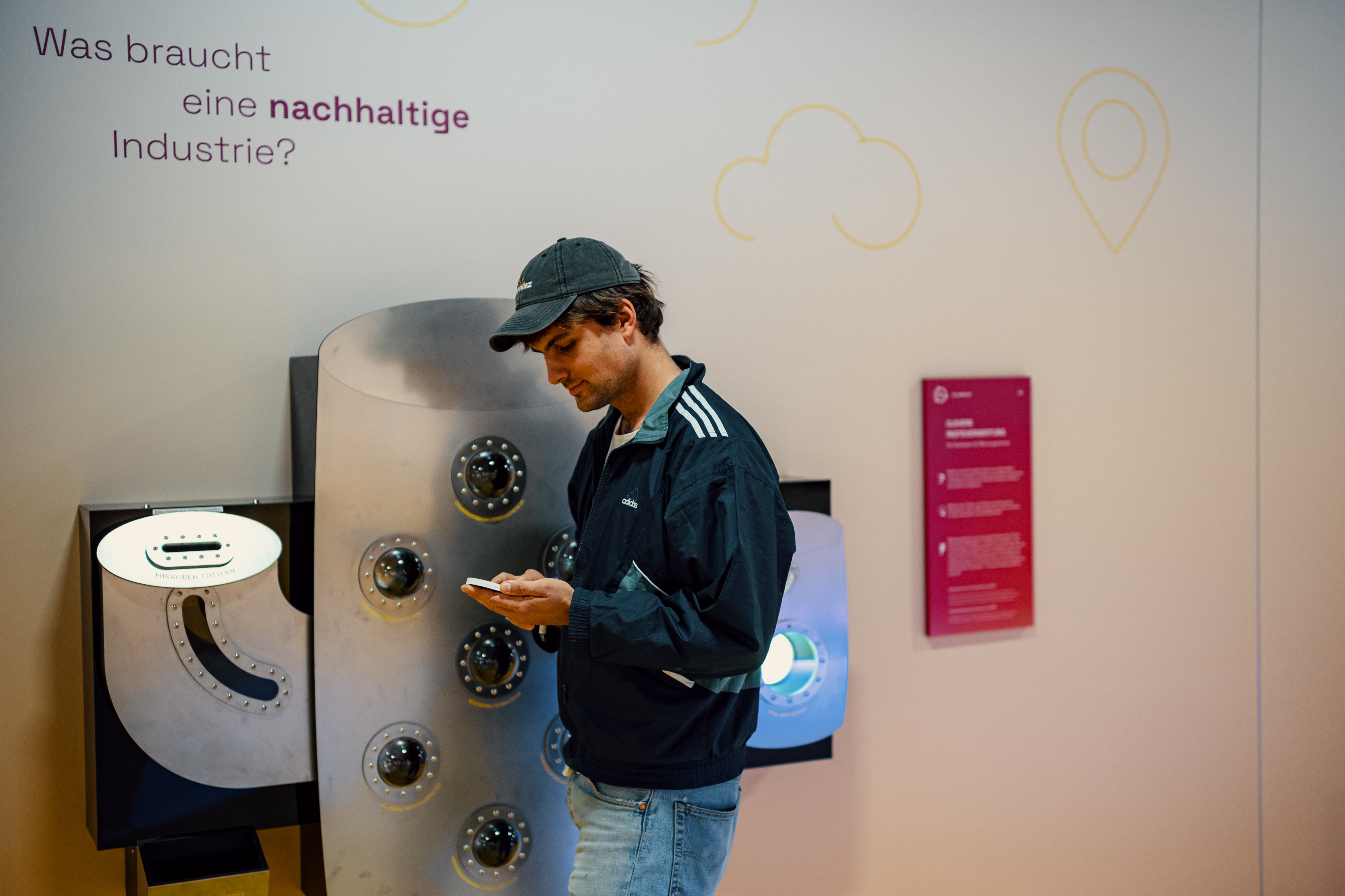 Aufmerksame Nutzer:innen können dabei lernen, welcher Reststoff mit welcher Mikrobe in welchen Nutzstoff umgewandelt werden kann. Aber auch wenn man sich für diese Details nicht sonderlich interessiert bleibt wahrscheinlich die Kernaussage des Exponats hängen: