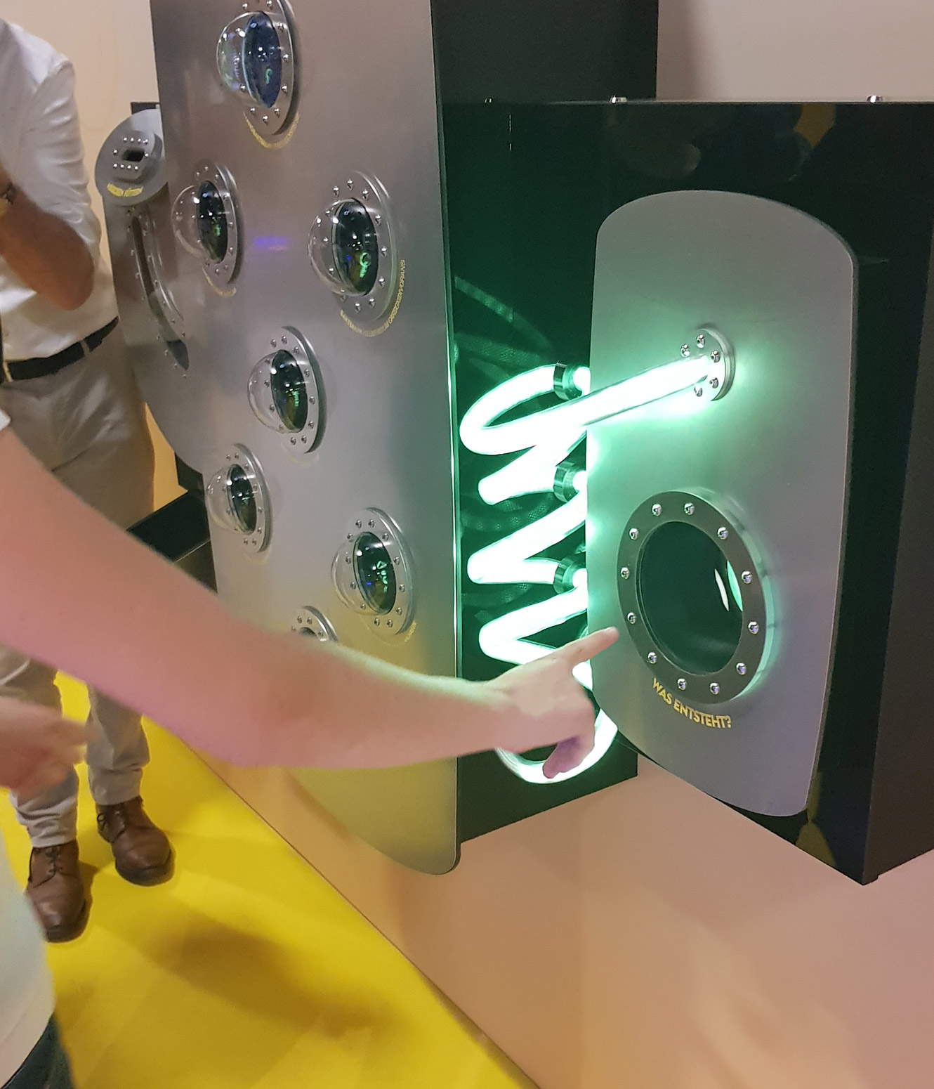 Der Mikrobenfutterautomat ist ein interaktives Exponat, das die Besucher:innen Mikroben füttern lässt. Die Mikroben werden mit Reststoffen gefüttert. Dabei wird spielerisch vermittelt, wie mithilfe von Mikroben aus vermeintlich Unbrauchbarem neues entsteht.