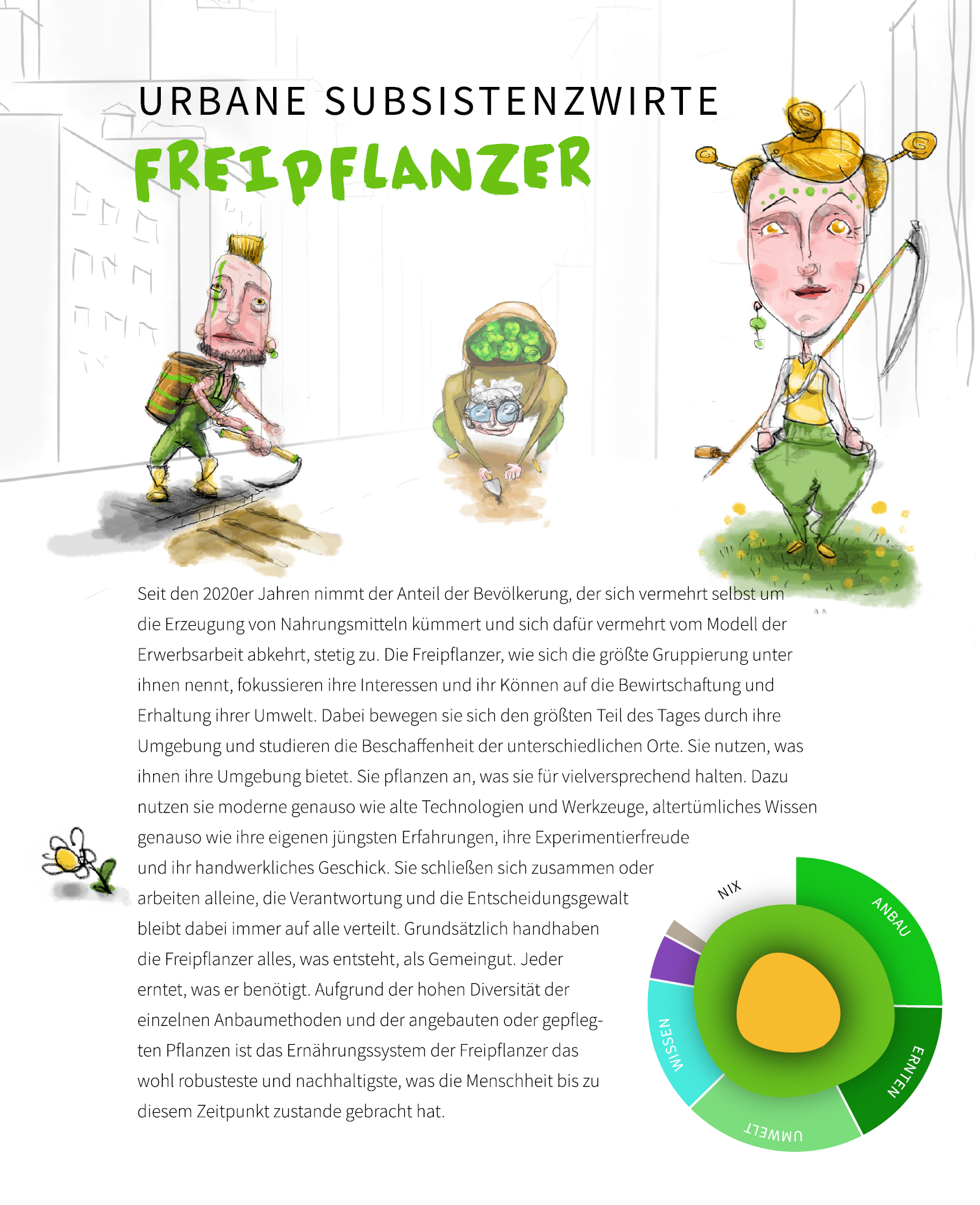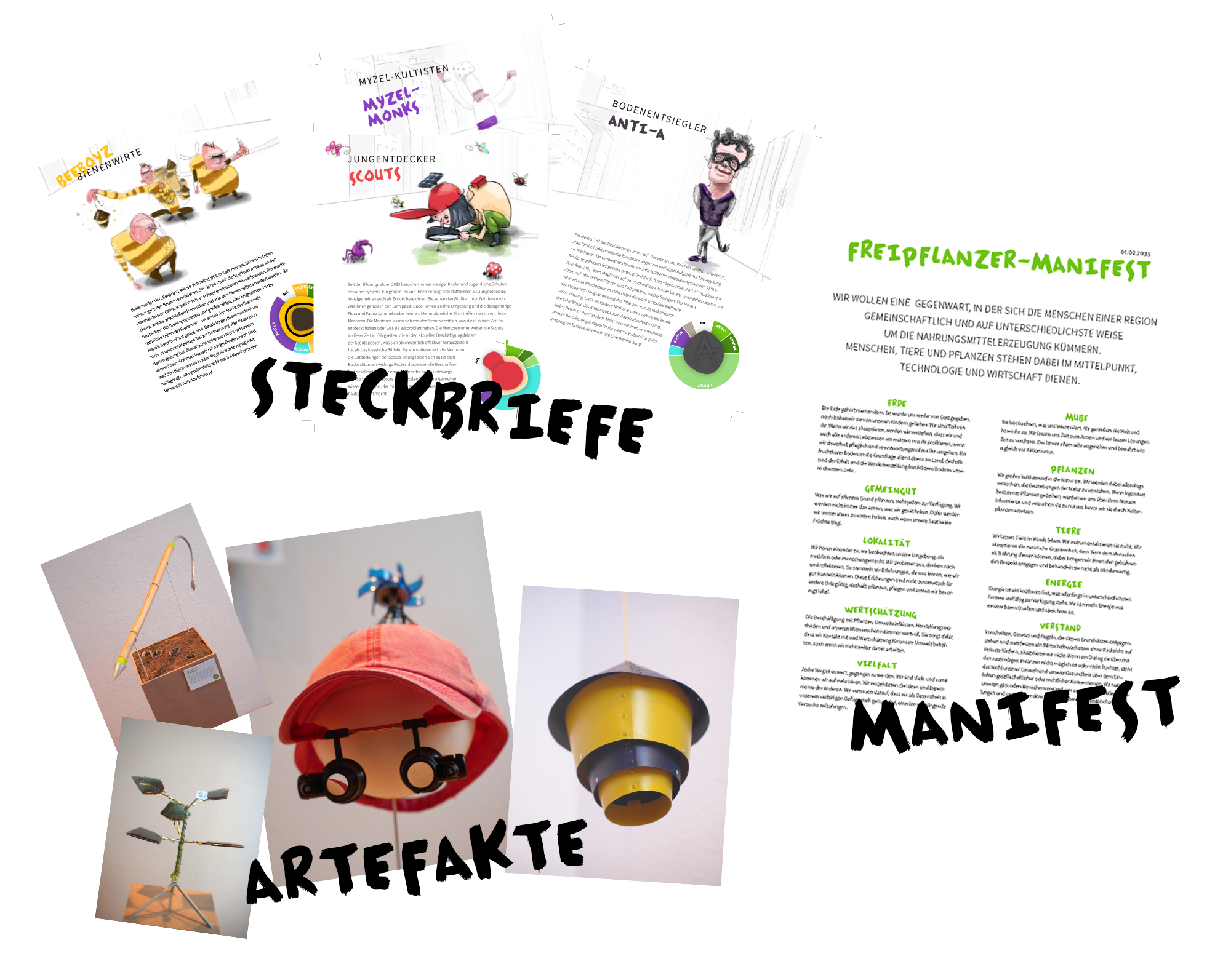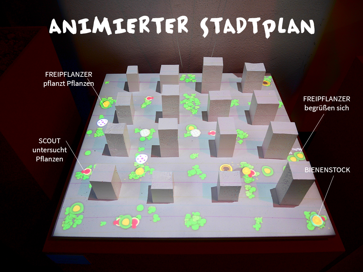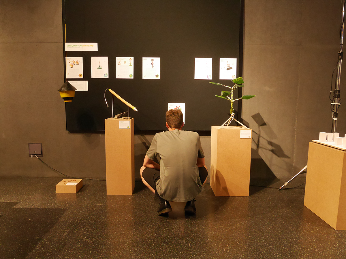 Nachwachstumsgesellschaft besteht aus steckbriefartigen, illustrierten Darstellungen exemplarischer Gesellschaftsgruppierungen. Diese werden unterstützt durch berührbare Artefakte. Und als dritte Komponente sorgen Infografiken, das Freipflanzermanifest und ein animiertes Stadtmodell für die nötigen Meta-Informationen, um in den Köpfen der Betrachter:innen eine komplexe Vorstellung dieser Gesellschaft zum Leben zu erwecken.