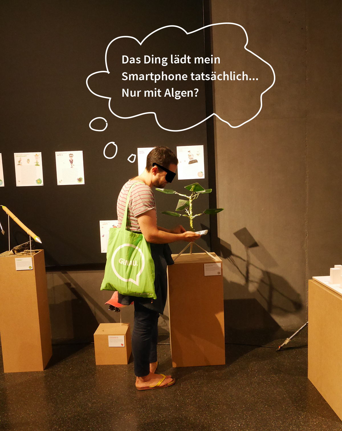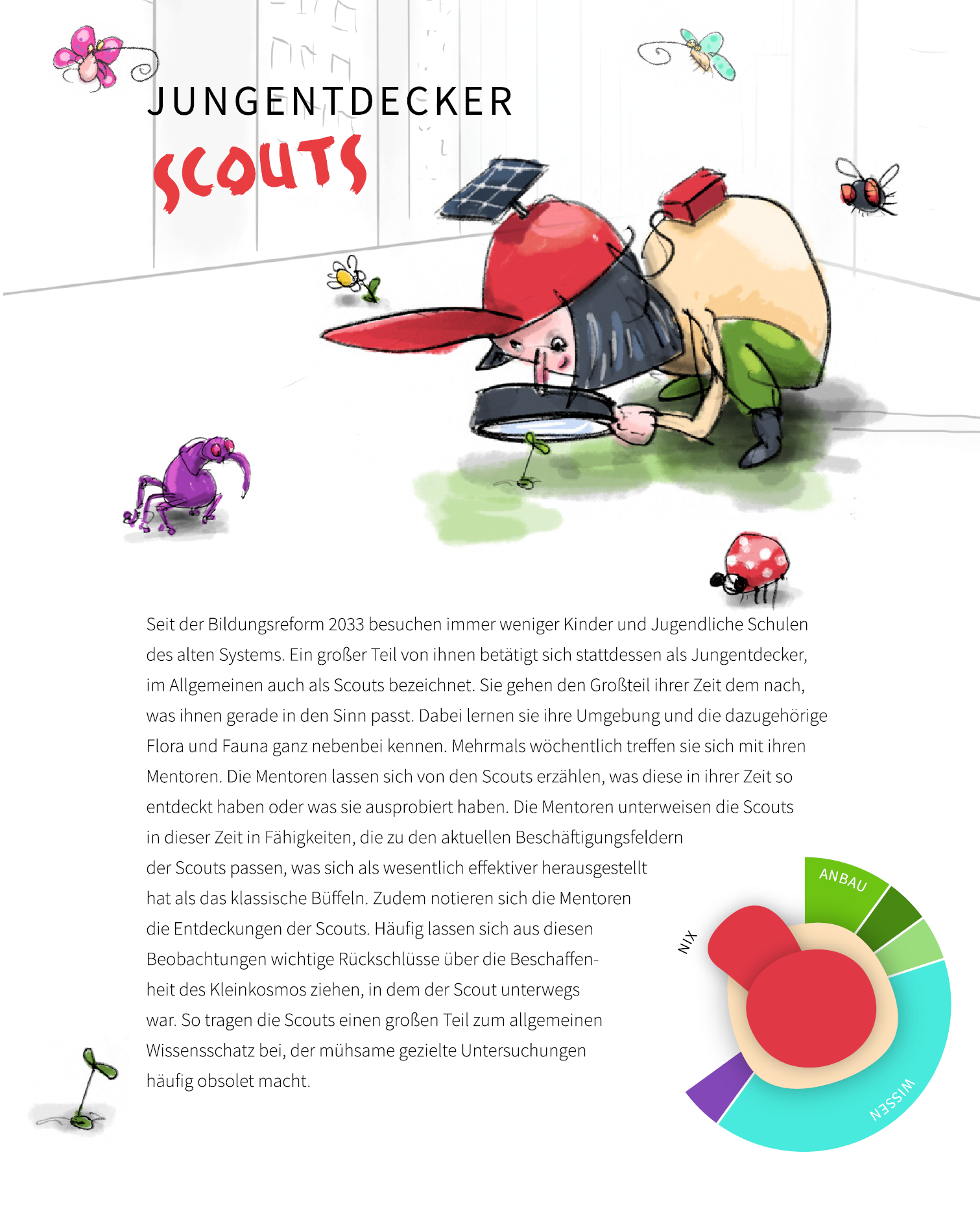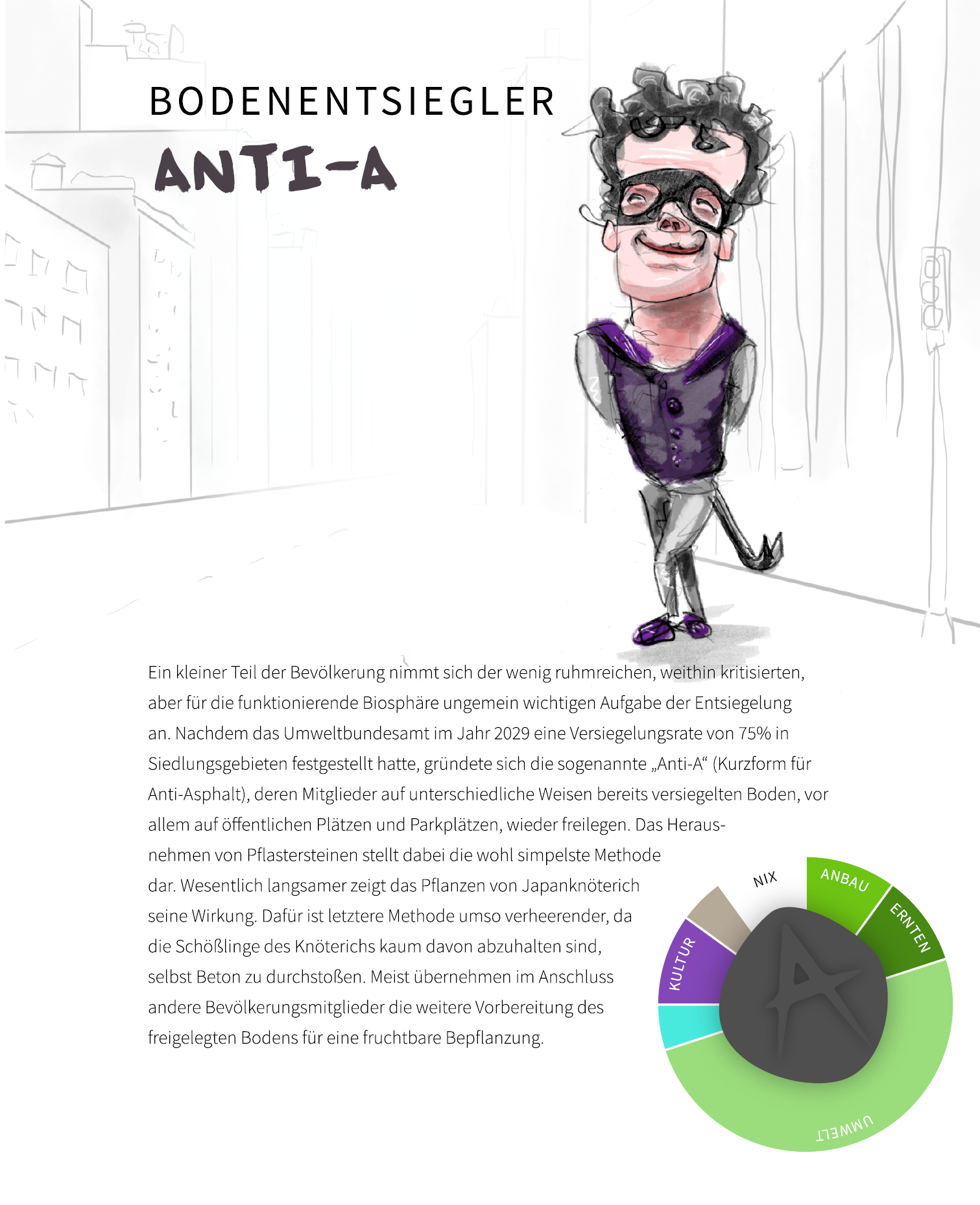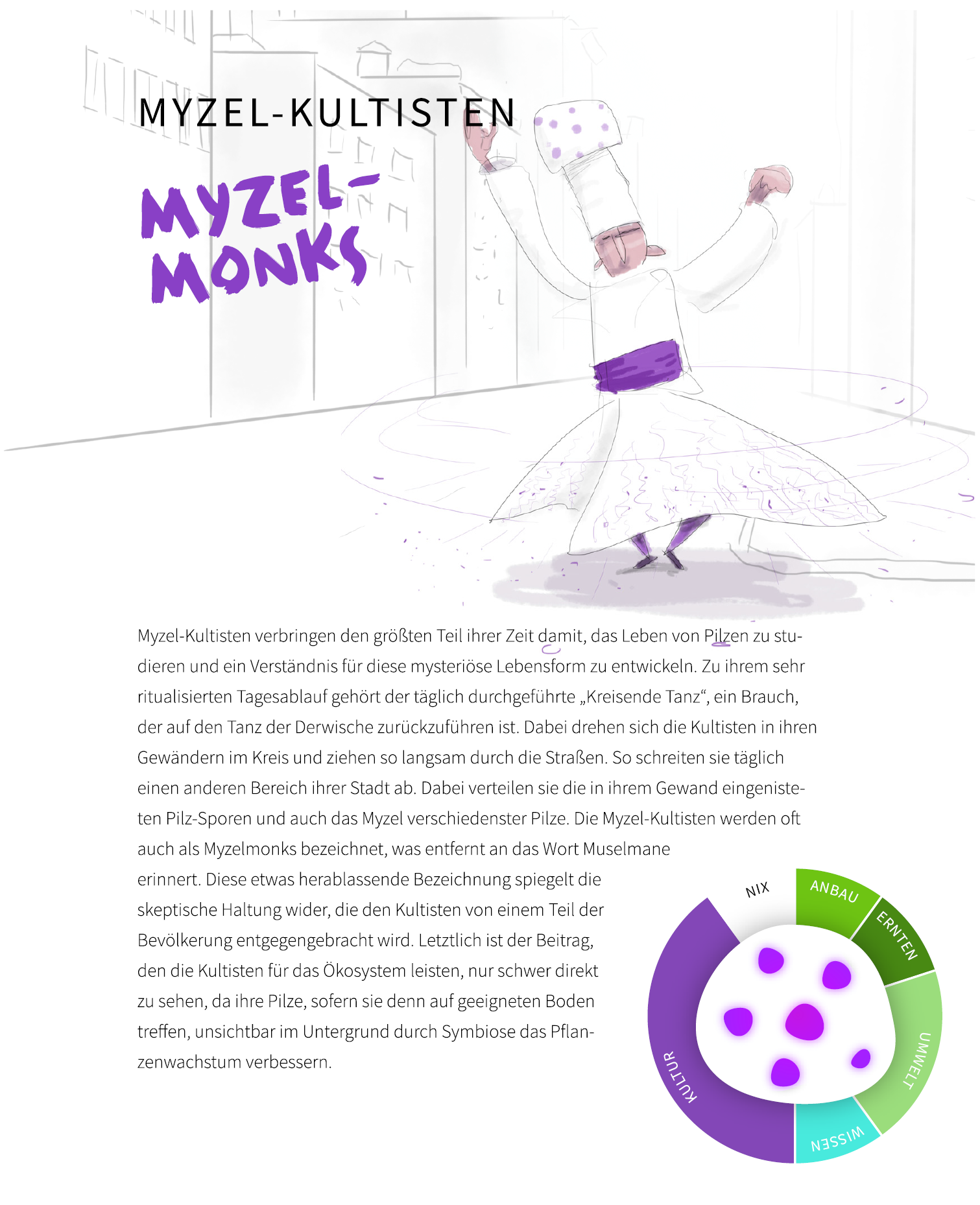 Nachwachstumsgesellschaft besteht aus steckbriefartigen, illustrierten Darstellungen exemplarischer Gesellschaftsgruppierungen. Diese werden unterstützt durch berührbare Artefakte. Und als dritte Komponente sorgen Infografiken, das Freipflanzermanifest und ein animiertes Stadtmodell für die nötigen Meta-Informationen, um in den Köpfen der Betrachter:innen eine komplexe Vorstellung dieser Gesellschaft zum Leben zu erwecken.