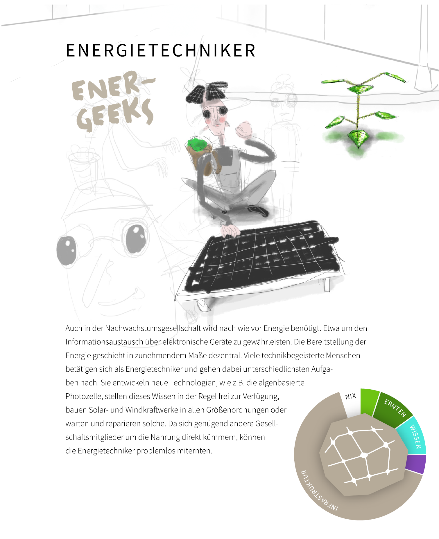 Nachwachstumsgesellschaft ist ein Zukunftsentwurf. Ein Bild einer Gesellschaft, in der die Potenziale aller Menschen zum Tragen kommen. Die Leidenschaften werden ausgelebt, Neigungen werden berücksichtigt. Im Unterschied zu unserer aktuellen Gesellschaft konzentrieren die Bewohner dieser urbanen Bevölkerung allerdings ihre Talente verstärkt auf die gemeinschaftliche Nahrungsmittelproduktion. Der Entwurf ist als Ausstellungskonzept gedacht, weshalb sich die Frage stellte:
