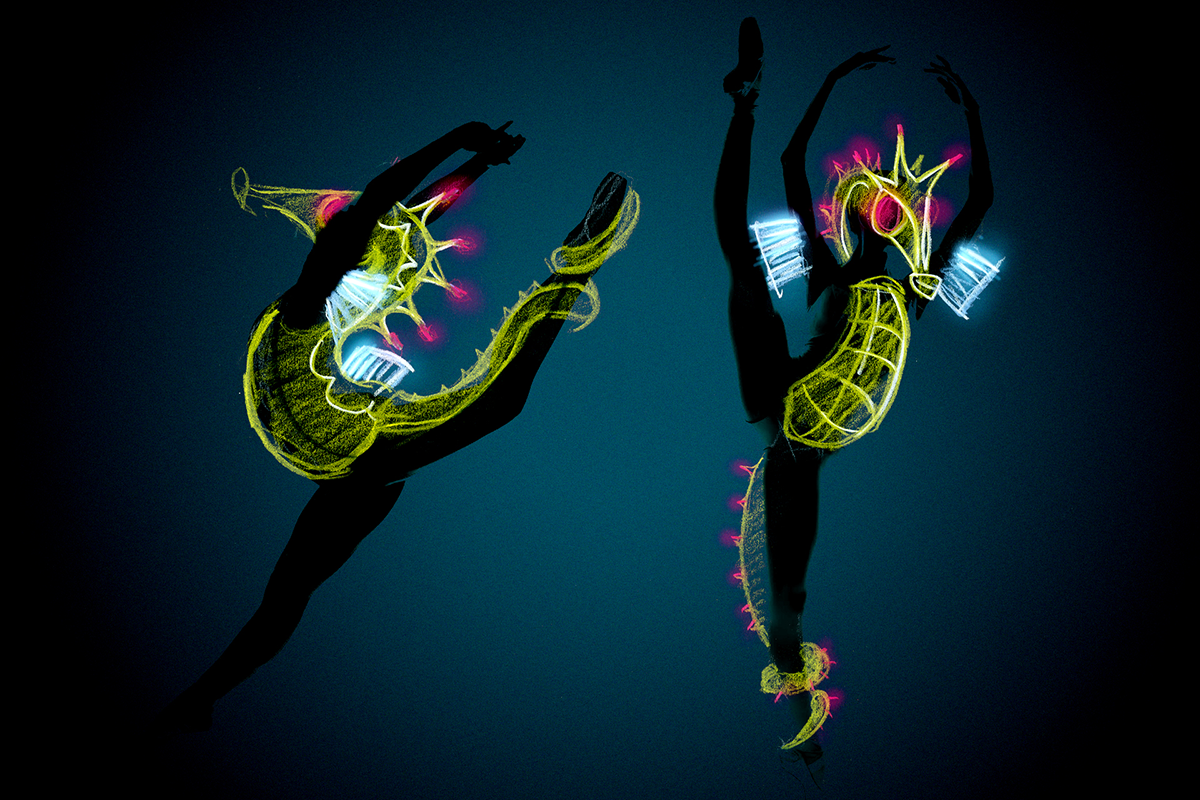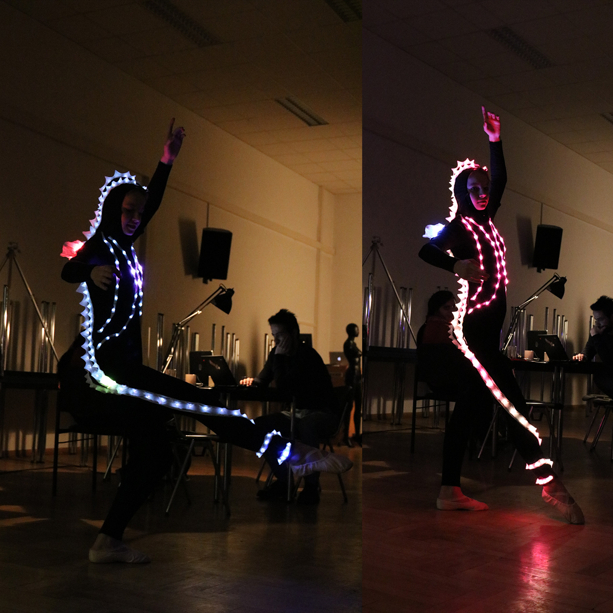 Tahira Sohaib, Fernando Cardenas und ich setzten gemeinsam ein beleuchtetes, bewegunsreaktives Balettkostüm für die Figur des Seepferdchens um.